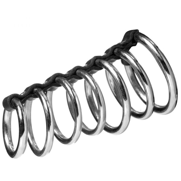 Put your penis in purgatory with the Gates of Hell Chastity device! This chastity devices is made up of a series of 5 nickel plated steel rings, attached together by a leather strap. The first ring is for your cock and the balls the rest of the rings are to secure the penis.