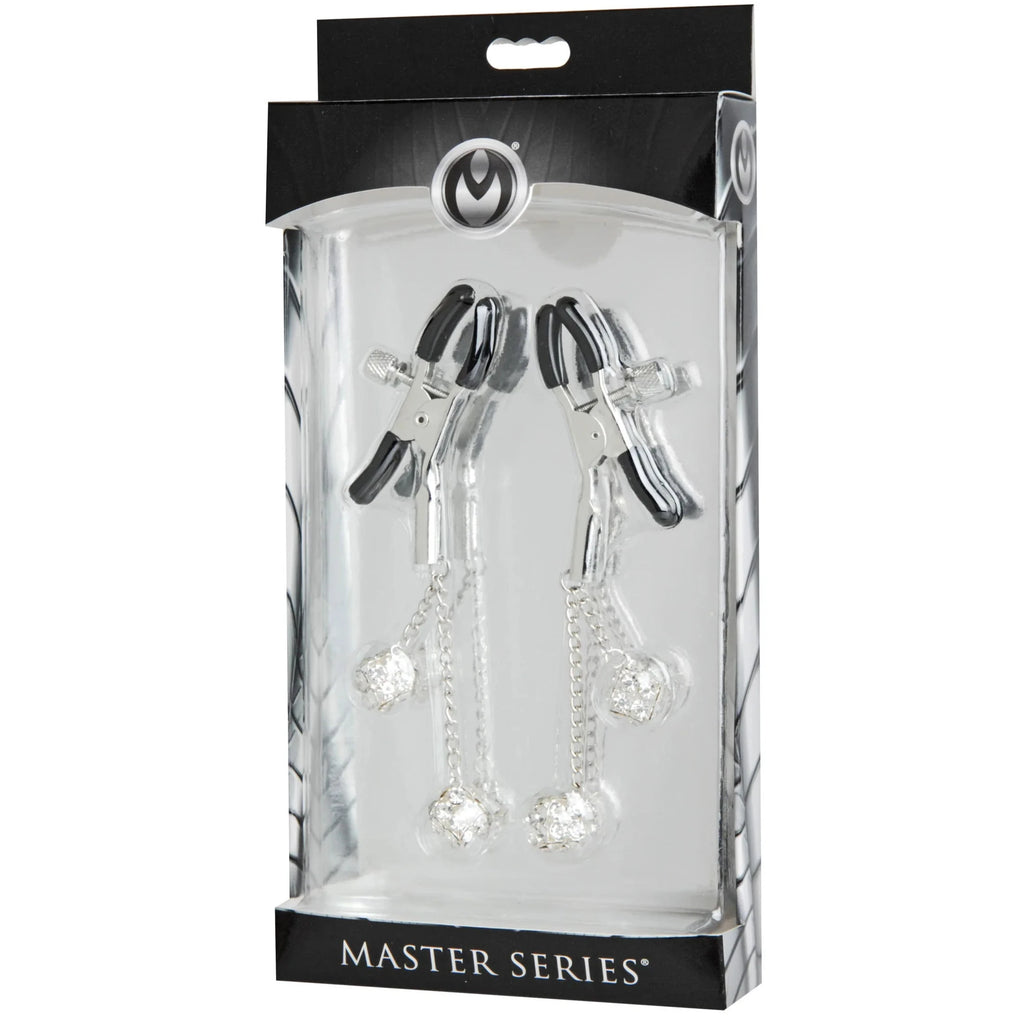 This sparkling set of rhinestone adorned nipple clamps will give you a dazzling way to make sure their eyes stay on you! The cube shaped embellishments are set on all sides with clear sparkling gems which catch the light with every movement. The clamps themselves are vinyl coated, with a thumb screw that allows you to adjust the tightness as you need it. The adjustable pressure make them ideal for all experience levels.