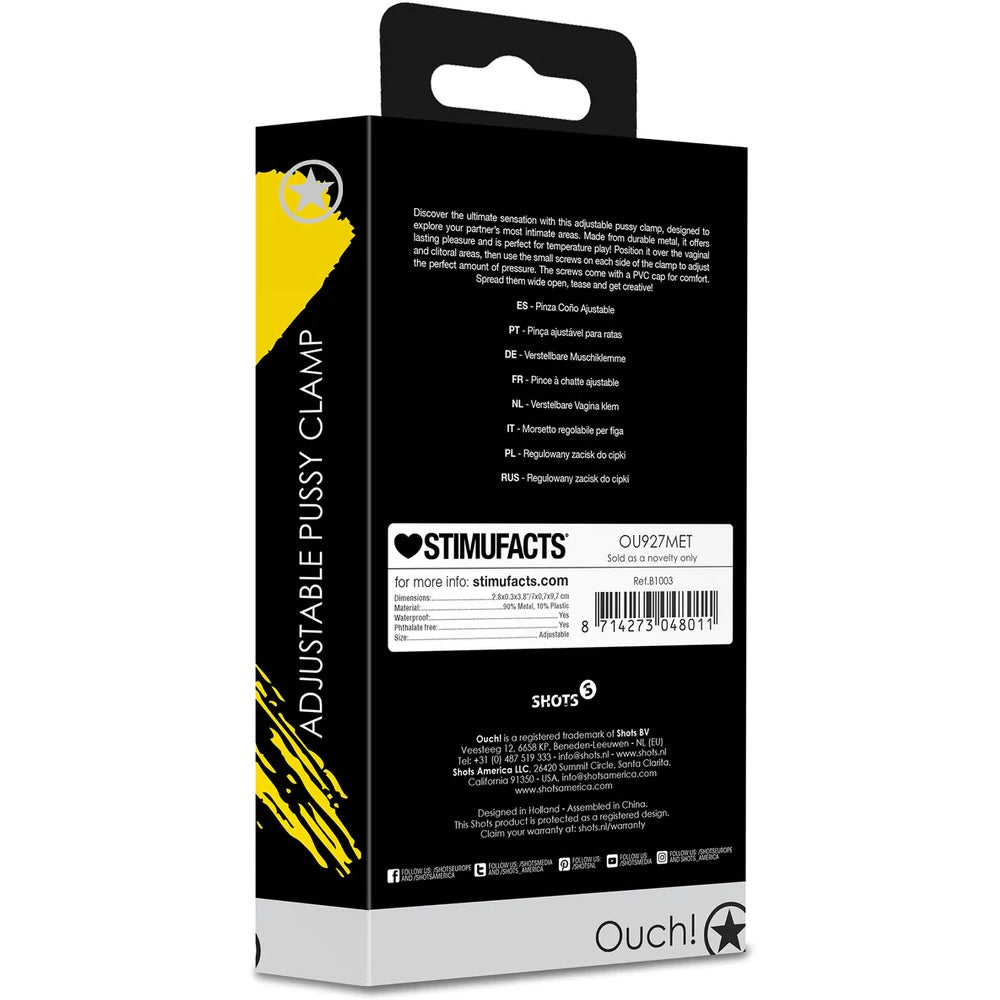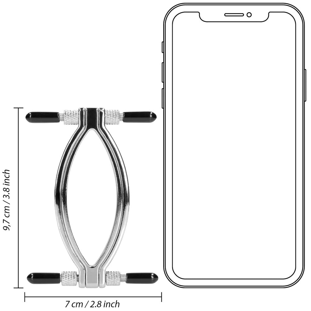 Discover the ultimate sensation with this adjustable pussy clamp, designed to explore your partner's most intimate areas. Made from durable metal, it offers lasting pleasure and is perfect for temperature play! Position it over the vaginal and clitoral areas, then use the small screws on each side of the clamp to adjust the perfect amount of pressure. The screws come with a PVC cap for comfort. Spread them wide open, tease and get creative!