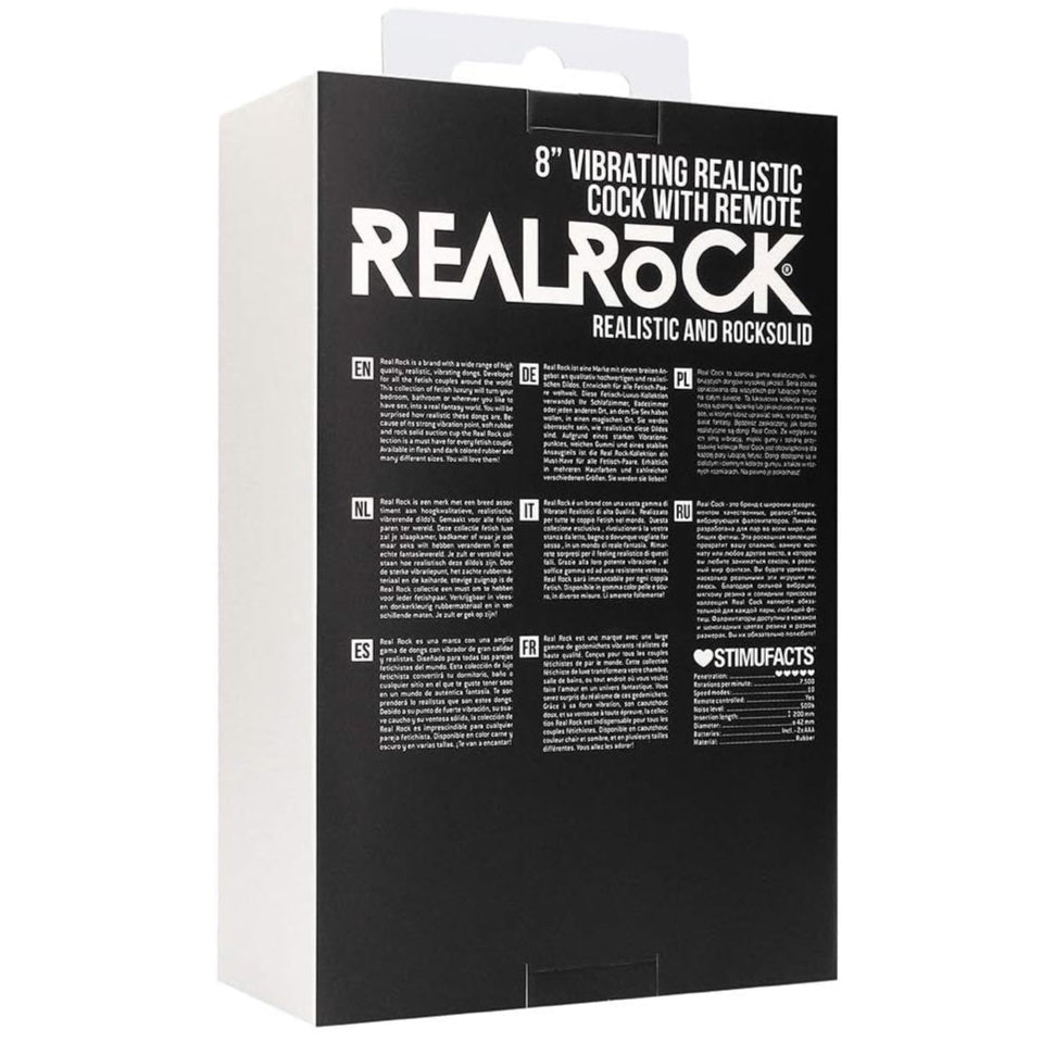 Enjoy the high quality 8 inch vibrating realistic cock, designed with a realistic head as a strong vibration point, veins for extra stimulation and scrotum for the realistic feel. You will be surprised how realistic this dong is!The rock solid suction cup stick to nearly any surface for a good time in your bedroom, bathroom or wherever you like to have sex. So turn your favourite spot into a RealRock fantasy world!Insert the batteries we provide with the toy and take control for the most intense orgasm you've ever imagined!All dongs by RealRock are made of rubber, are available in skin and black and because of its beautiful packaging its a must have for every dong lover and every store all over the world!