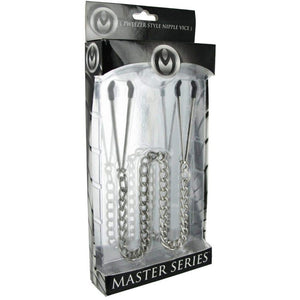 These sexy tweezer nipple clamps are designed to exert either light or strong pressure with a simple sliding clamp. Vinyl coated ends attached to a linked chain. Your plaything will love the variation between light and intense pressure, and the chain serves as a visual adornment for a sensual look.