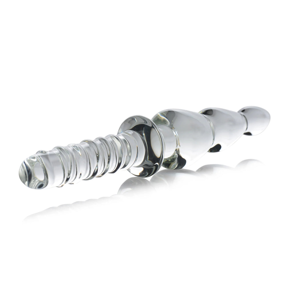 This sturdy, slick borosilicate glass thrusting toy has three graduated beads, swelling in size as you go deeper. The tapered tip is a moderate size for easy insertion, with a ribbed handle for easy grip. The non-allergenic material is body safe and compatible with all lubes. The non-porous nature of glass makes it easy to clean and sterilize. You can even heat it up or cool it down for some exciting temperature play. The shining glass is both elegant and durable, for a beautiful and sensual toy that will last and last!