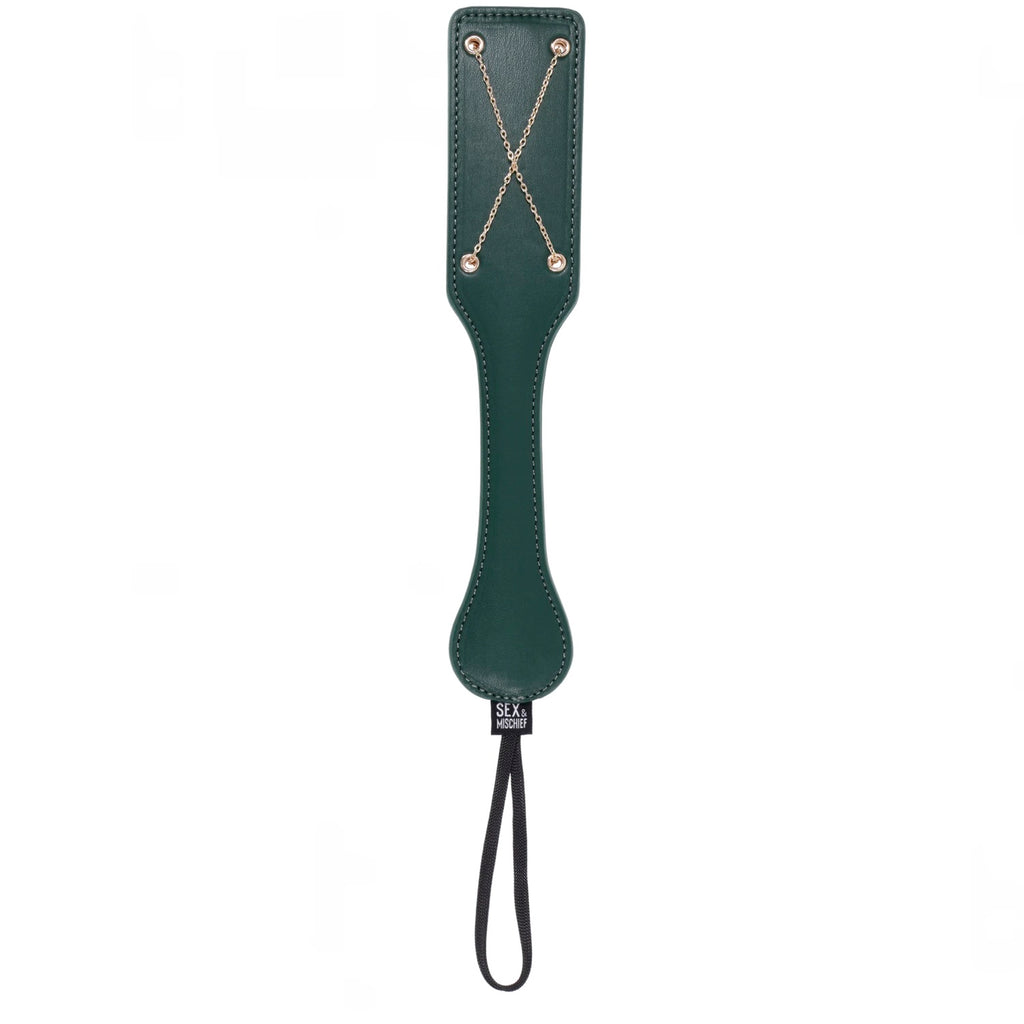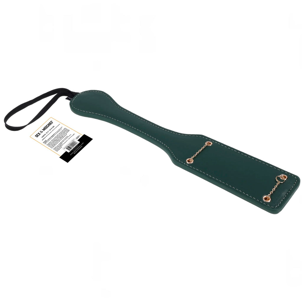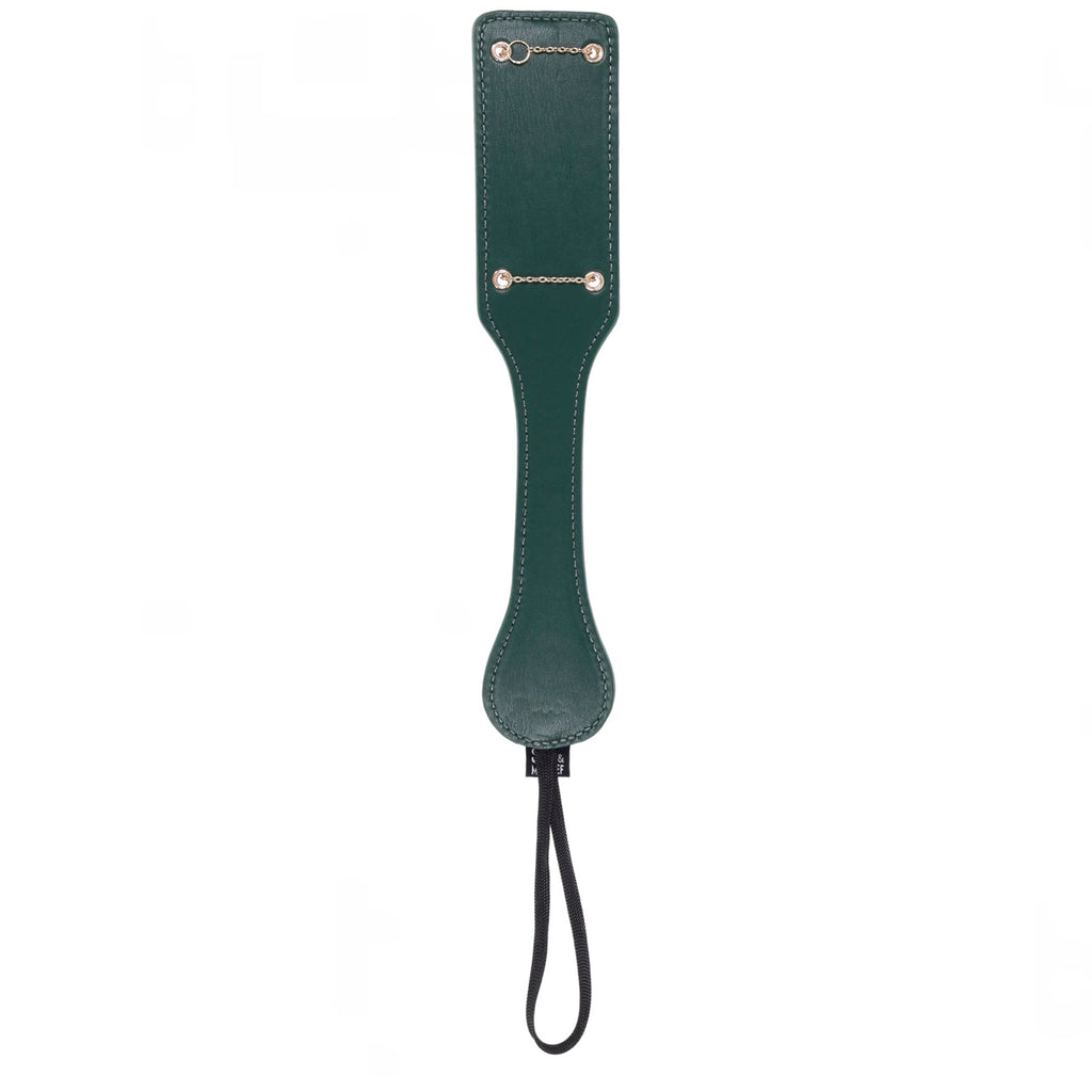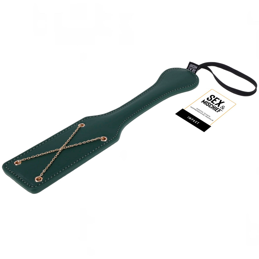 Leave a mark—in more ways than one. The Indica Chain Impressions Paddle features a luxe gold chain embedded in emerald green faux leather, creating a striking texture that may leave a delicate imprint with each spank. Delivering a satisfying thud with just a touch of sting, this paddle is as beautiful as it is bold. Display it proudly or keep it close for those moments when a little discipline turns into a lot of fun.