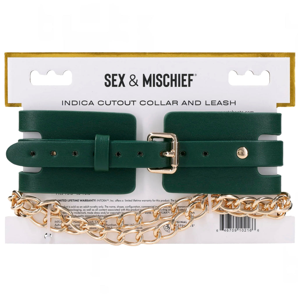 Surrender in style. The Indica Cutout Collar wraps the neck in rich emerald green with luxe gold hardware and sensual cutout accents that expose just enough skin. Lined for comfort, this collar is a soft but striking symbol of submission—an invitation to give in and give over. The coordinating gold chain leash with green handle lets your dominant guide the pace, whether you’re at home or on display. Pair with the Indica Cutout Cuffs for a beautifully bound look.