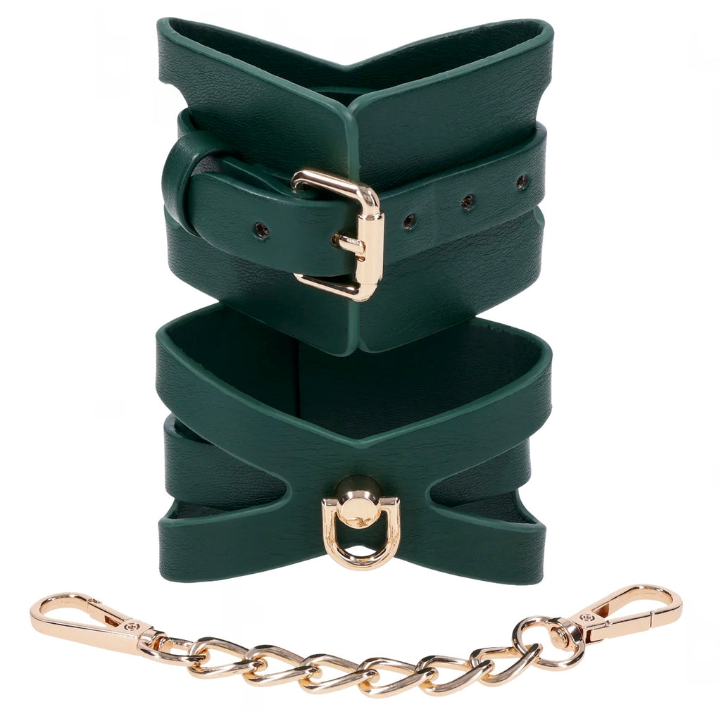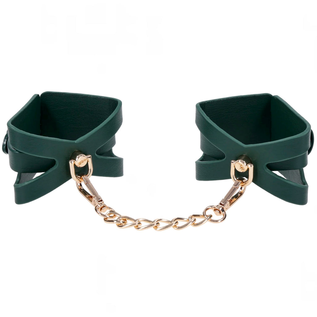 Surrender in style. The Indica Cutout Collar wraps the neck in rich emerald green with luxe gold hardware and sensual cutout accents that expose just enough skin. Lined for comfort, this collar is a soft but striking symbol of submission—an invitation to give in and give over. The coordinating gold chain leash with green handle lets your dominant guide the pace, whether you’re at home or on display. Pair with the Indica Cutout Cuffs for a beautifully bound look.