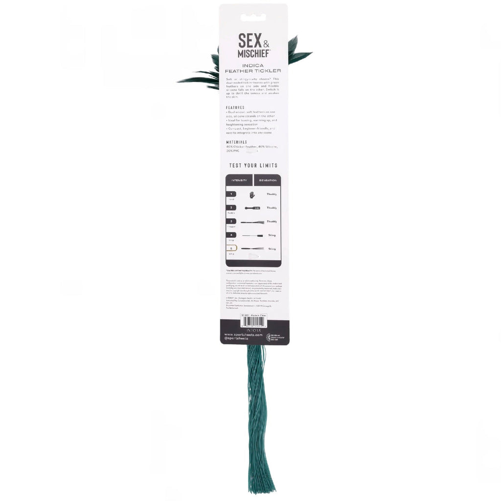 Explore the art of contrast. The Indica Feather Tickler is a dual-ended tool that teases and tantalizes with every stroke. One side features soft green feathers for delicate sensory play, while the other delivers a light sting with flexible silicone falls. Use it to awaken nerve endings, set the mood, or surprise your partner with an unexpected switch in sensation. It's a two-in-one treat designed for touch you won't forget.