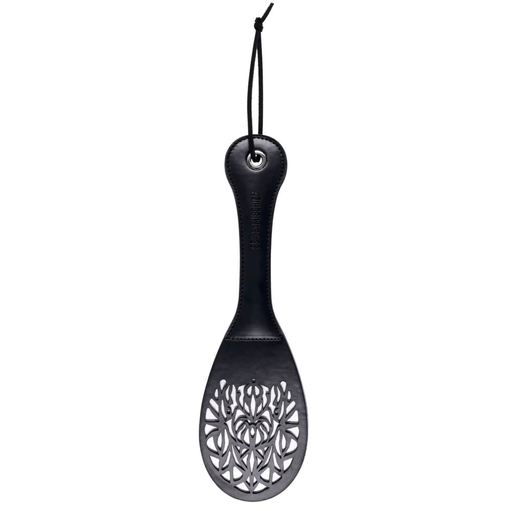Savor the irresistible blend of pain and pleasure with the Lace Spanker. This petite yet powerful paddle is designed to evoke a sensual mix of elegance and excitement. Made from sumptuous faux leather and adorned with a beautifully intricate lace cutout that brings an air of seductive charm to every playful swat. The split tips produce a satisfying snap, while the delicate lace details add a touch of mystery and allure. Perfectly sized for both teasing taps and firmer impacts, the Lace Spanker is the ideal accessory for those who crave a balance of indulgence and irresistible temptation.