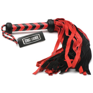 The many tails of this suede flogger will flash red and black as they impact the skin of your sub. Each strand is supple and soft, but will land with a sting when used properly. The handle is leather wrapped in an elegant black and red herringbone pattern, and features a matching leather wrist loop.