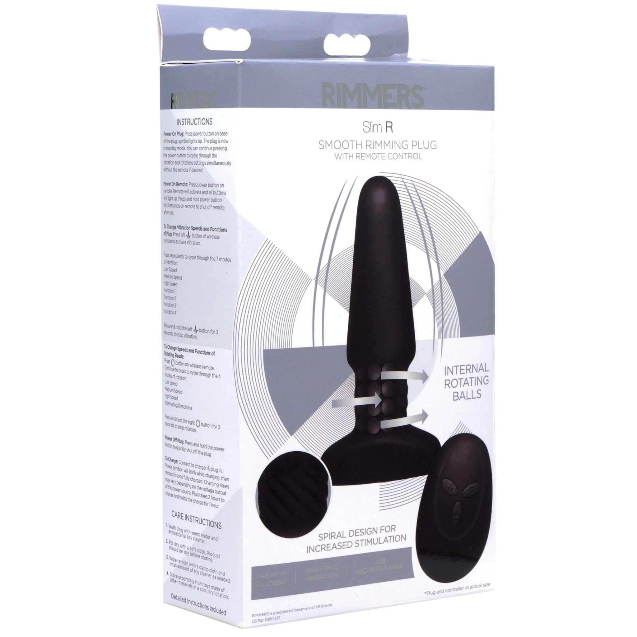 Our classic Model R Rimmer is now available in a slimmer size for those that prefer less girth! This high-tech tool has a tapered tip so that it can slide in comfortably and deliver the ultimate anal pleasure. Better than your average butt plug, this revolutionary sex toy will actually massage the opening to your hole with rotating beads and a spiral texture along its stem, providing a sensation similar to a rim job! Play with 3 speeds and 2 functions of swirling satisfaction around your sphincter. You will also be treated to 3 speeds and 5 patterns of vibration as the plug thrums inside you. An optional remote control can make playing on your own easier, but it can also provide wireless fun with a partner. Light up buttons on the remote and the plug make them easy to see in the dark. Made of premium silicone, this exciting tool is non-porous, phthalate-free, and waterproof for a body-safe experience and thorough sanitization with soap and water.