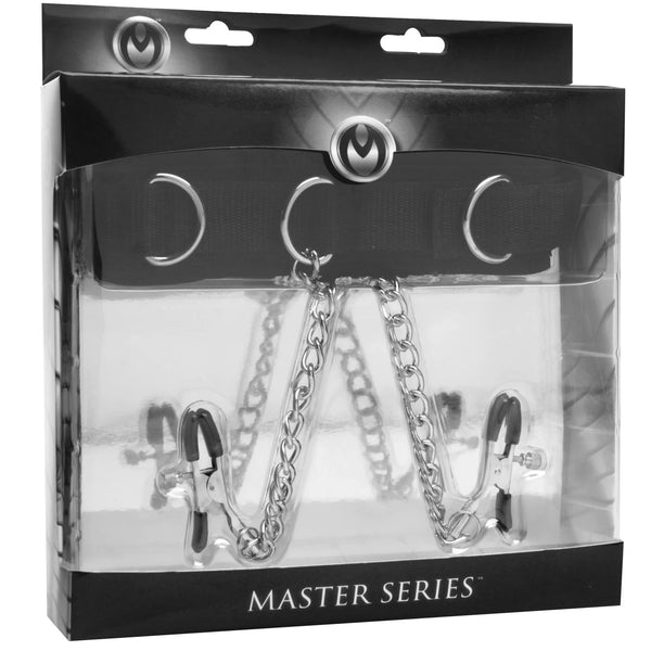 Imagine the seductive combination of collar and clamp, pleasure and pressure. Master Series has your fix with Submission Collar and Clamp Union. This two in one set is made with submission in mind. The quality collar is made more comfortable with the addition of a neoprene inner lining, and secures by means of a double Velcro binding. The collar has two extra D rings, if you want to add weights, rope, or any other accessory you can imagine. This duo features a 14 inch chain that splits in two at 8 inches, attaching to the collar at a front D ring. Each chain ends at an adjustable alligator style nipple clamp, easily made tighter with thumb screws. Each clamp has a vinyl tip for added comfort and better grip. Adorn the neck of your naughty one with this striking collar, as the chain dangles seductively against their chest.
