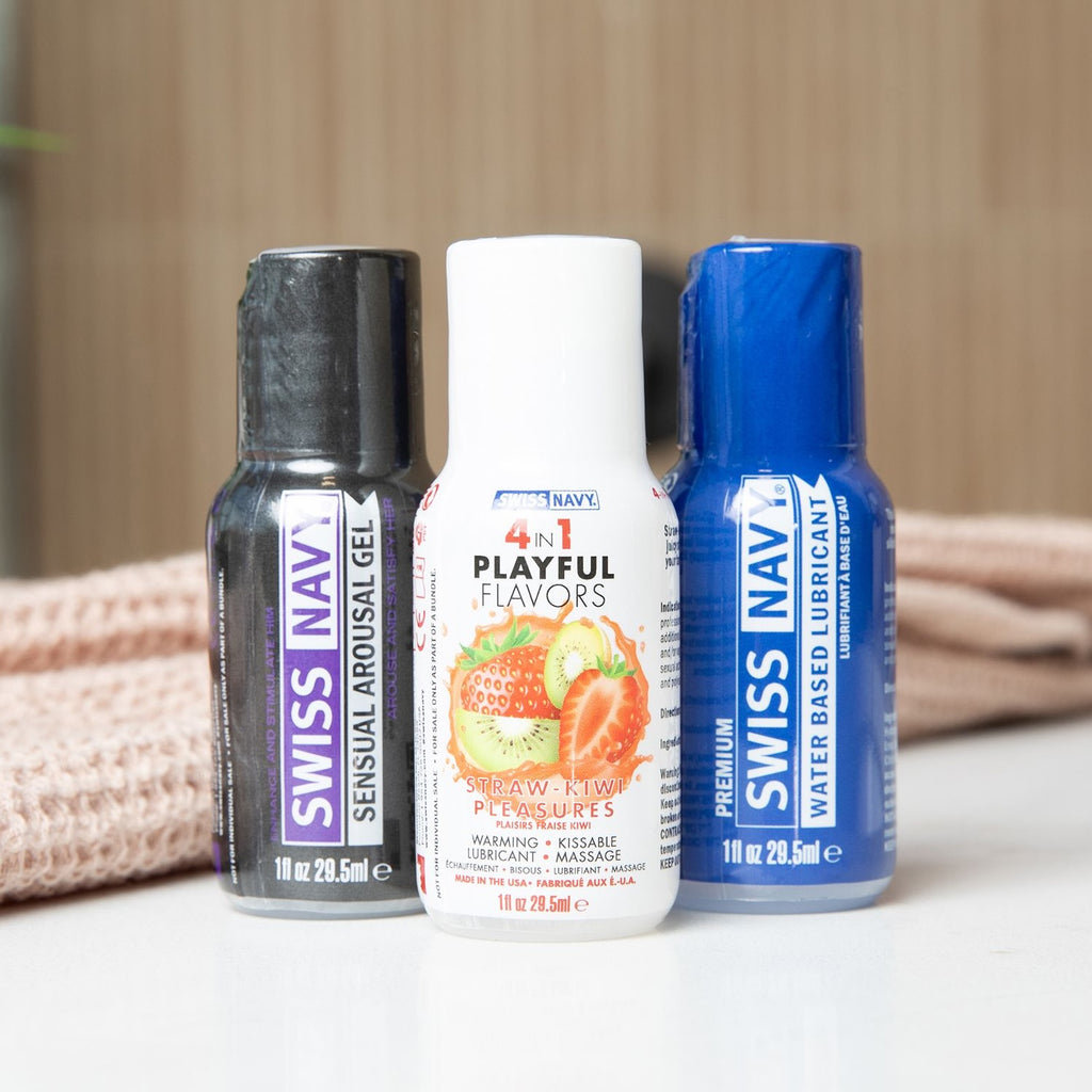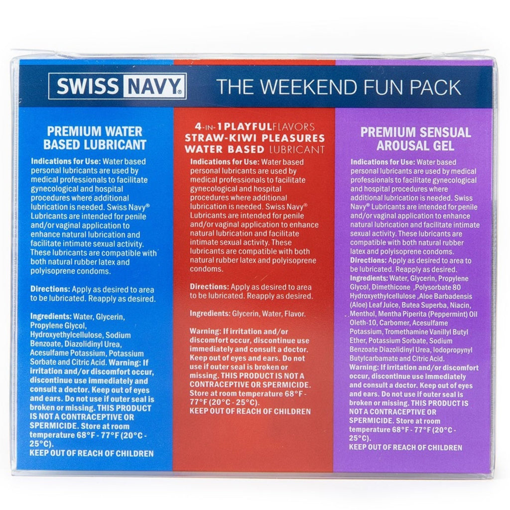 Curious to explore more pleasure options? This Weekend Fun Pack was designed with you in mind. Included in the Weekend Fun Pack Swiss Navy’s Premium Water-based Lubricant provides a smooth, clean glide that enhances your body’s natural moisture. 4 in 1 Playful Flavors in Straw-Kiwi Pleasures flavor offers four ways to play: adds an element of warming pleasure, for delicious edible fun, as a smooth water-based lubricant, and for an arousing massage. Swiss Navy’s Sensual Arousal Gel is a unique formula that helps stimulate and arouse intimate sensations for both partners.