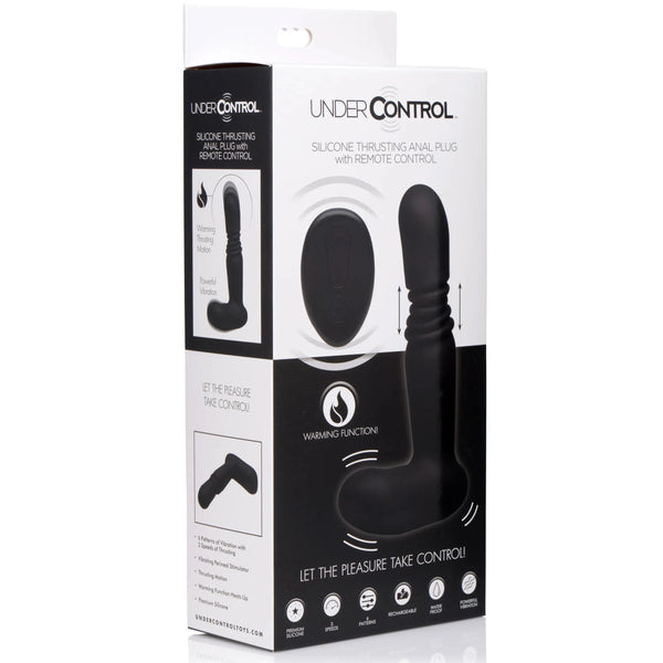 This anal tool vibrates, thrusts, and even warms up with the push of a button up to 25 feet away! Whether you appreciate the convenience during solo play, or the power during couples play, the wireless remote is an exciting feature for use at home or out on the town! Simple buttons allow you to play with 6 patterns of vibration and 3 speeds of thrusting. The tip will warm up to apply a comfortable, but exciting heat to that special spot. Ridges on the shaft provide an internal massage, while the external portion vibrates against your perineum. Let the pleasure take control with this easy-to-use, remote-controlled male pleasure tool. Made of premium silicone, it is phthalate-free for body safety, and non-porous for thorough sanitization. Clean this waterproof device after use with warm water and mild soap or toy cleaner.
