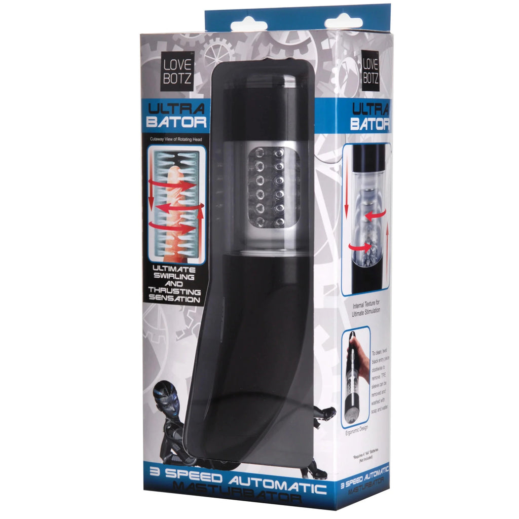 The Ultra-Bator features 3 speeds of swirling rotation sensation, AND up and down stroking action, all in one! The inner chamber is texturized with sensation feelers, and 4 windows on the sides that let you see all the action. This state of the art automatic masturbation tool boasts an ergonomic hand held design, and a user friendly control pad, with a constant stroking motion and unique rotation feature that adds a whole new dimension to masturbation. To use, just lube it up and insert your rod. Then turn on the stroker, select your speed, and let Ultra Bator do all the work!