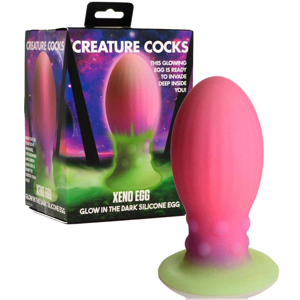 Expand your horizons beyond the known universe and get one of our alien xeno eggs by Creature Cocks! This pink, purple and green egg glows in the dark so you can have a radioactive looking alien egg! Or you can imagine that you are taking in a whole new kind of creature and their especially unique phallus! With ribbed sides and a bumpy neck you can enjoy extra stimulation. The tapered tip helps you insert it and the round, wide body gives you a satisfying fill! Use it vaginally and enjoy laying the egg as you push it out post-penetration! The egg is made from premium, phthalate-free silicone and is plush, silky smooth. Use only with water-based lubricants. After use, wash with warm water and mild soap then rinse and spray with a toy cleaner. Store in a cool, dark place. To make the toy glow, expose it to sunlight or a UV flashlight.