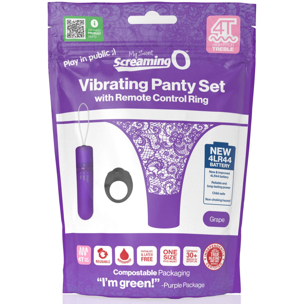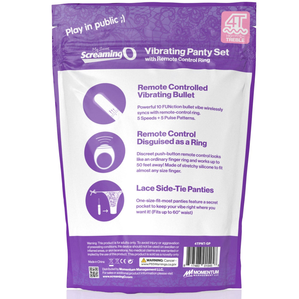 My Secret Screaming O 4T Panty Vibe puts the power of pleasure at your fingertips with a powerful, 4T treble style tickle and tease vibrating bullet that fits discreetly into a side-tie lace panty to keep it in place.