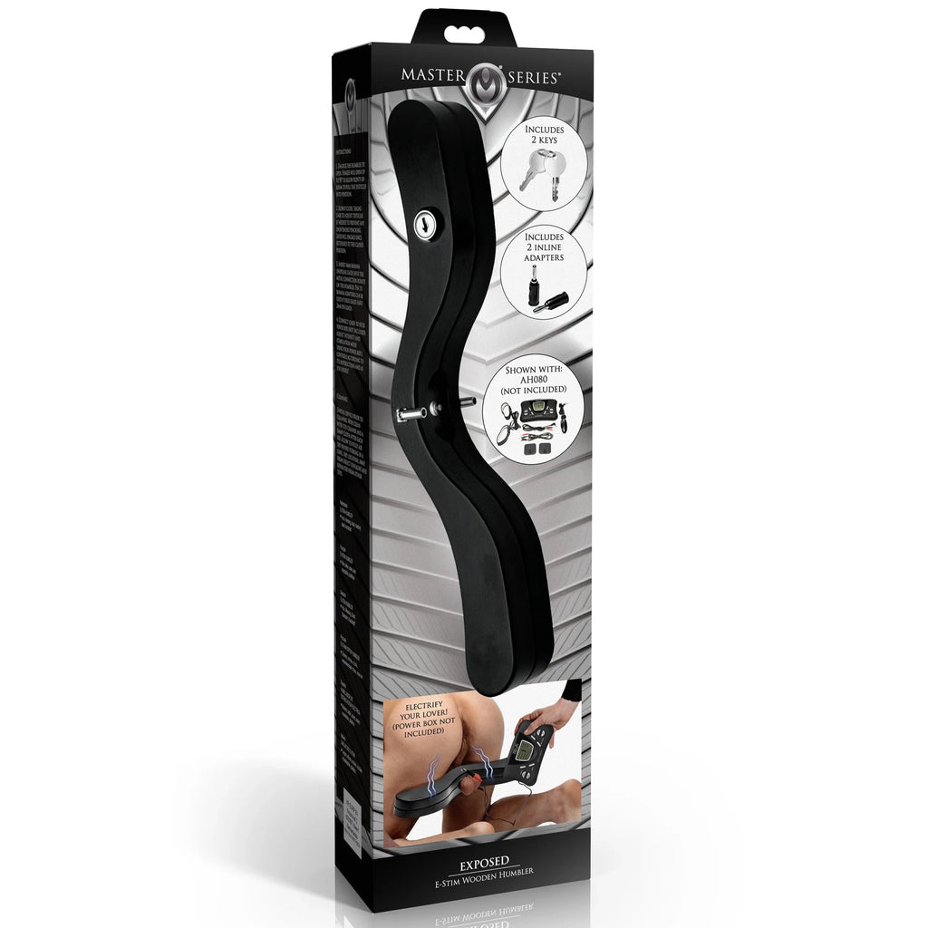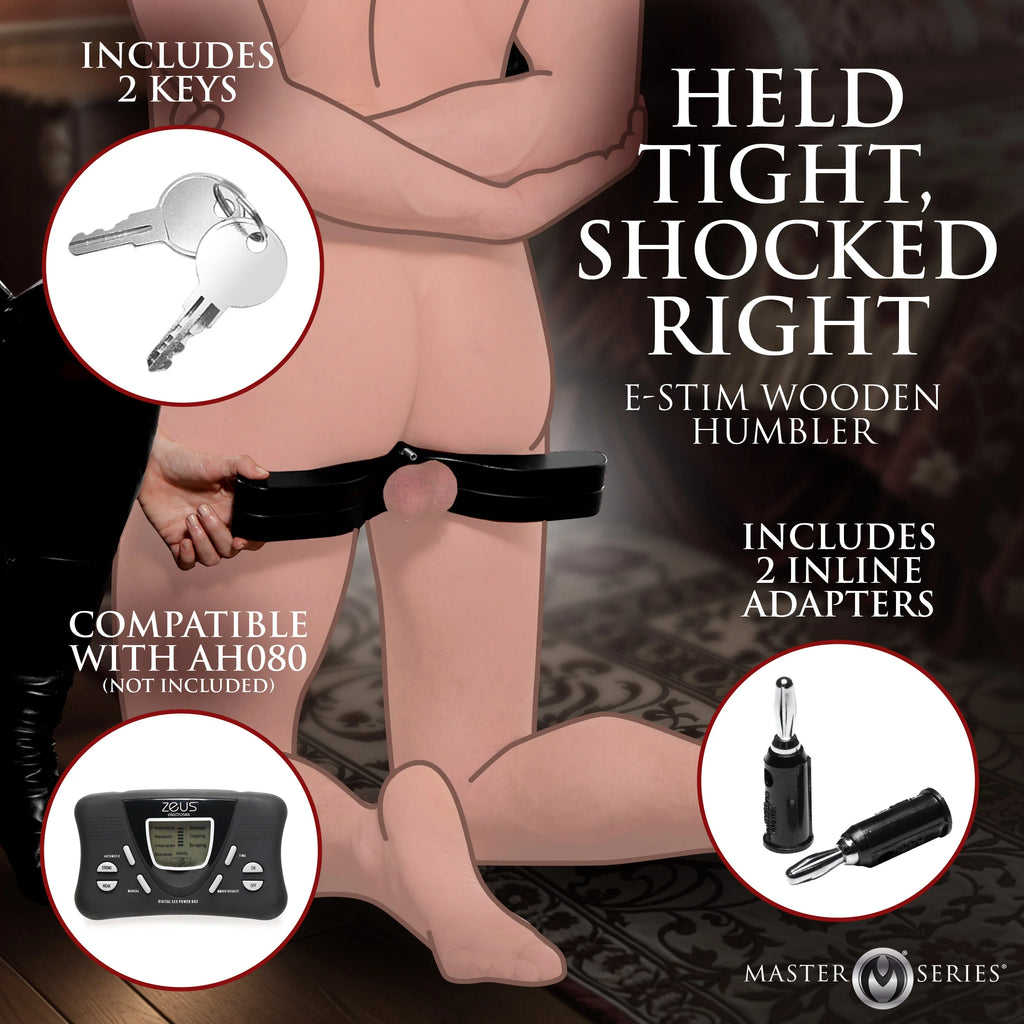 Transform your bondage play with the E-Stim Humbler. This kinky tool not only keeps them in a submissive position but also delivers stimulating electric shocks. Constructed from smooth wood, it is both durable and safe for intense sessions. Featuring two in-line adapters, you have twice the options for electric play, and it is compatible with most E-stim kits and boxes. The built-in locking mechanism enhances the restraint experience, and two keys are included. The hinged opening allows for easy adjustments while keeping everything aligned perfectly.